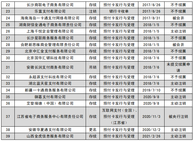√ 目前已注銷牌照的機構(gòu)有39家,注銷原因中,被央行吊銷牌照的機構(gòu)有4家;因被合并而注銷牌照的有11家;被央行決定不予續(xù)展的有16家;主動申請注銷的有7家;未提交續(xù)展申請的1家。