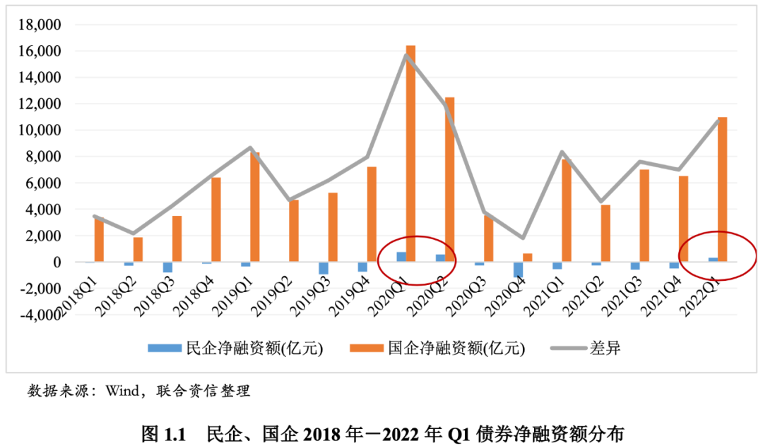 自2018年以來,民營(yíng)企業(yè)債券凈融資額的變化以及其與國(guó)企的差異反映出其整體在外部融資環(huán)境的負(fù)面沖擊下,所面臨的融資難困境。2018年-2022年1季度,民企債券凈融資額除2020年上半年和2022年一季度短暫為正外,其余季度均為負(fù)值,特別是各年的下半年,民企凈融資額負(fù)值均較大;而同期國(guó)企凈融資額均為正值,特別是民企為正值時(shí),國(guó)企凈融資更高,兩者分化進(jìn)一步加劇。這說明市場(chǎng)整體環(huán)境較差、外部融資環(huán)境負(fù)面沖擊較大時(shí),民企融資非常困難;市場(chǎng)環(huán)境放松時(shí),民企融資雖然好轉(zhuǎn),但從獲利力度上不如國(guó)企。
