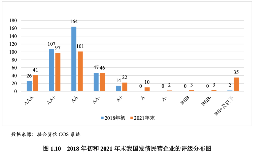 自2018年以來,民營(yíng)企業(yè)的信用評(píng)級(jí)變化反映出其整體信用能力不斷弱化,信用評(píng)級(jí)機(jī)構(gòu)通過評(píng)級(jí)調(diào)整對(duì)民營(yíng)企業(yè)的違約風(fēng)險(xiǎn)進(jìn)行了提示和預(yù)警。從評(píng)級(jí)調(diào)整看,2017-2021年間,民營(yíng)企業(yè)的評(píng)級(jí)調(diào)整率先降后升,評(píng)級(jí)調(diào)升率整體呈下行趨勢(shì),而評(píng)級(jí)調(diào)降率則整體呈上升趨勢(shì)。與整個(gè)債券市場(chǎng)相比,民營(yíng)企業(yè)的評(píng)級(jí)調(diào)整率明顯高于債券市場(chǎng)總體,評(píng)級(jí)調(diào)升率整體低于債券市場(chǎng)總體,評(píng)級(jí)調(diào)降率則顯著高于債券市場(chǎng)總體。2017年,民營(yíng)企業(yè)的評(píng)級(jí)調(diào)升率尚高于評(píng)級(jí)調(diào)降率6.68個(gè)百分點(diǎn),但自2018年發(fā)生逆轉(zhuǎn),其評(píng)級(jí)調(diào)降率顯著高于評(píng)級(jí)調(diào)升率,直至2021年評(píng)級(jí)調(diào)降率高于評(píng)級(jí)調(diào)升率9.57個(gè)百分點(diǎn),見圖1.8。