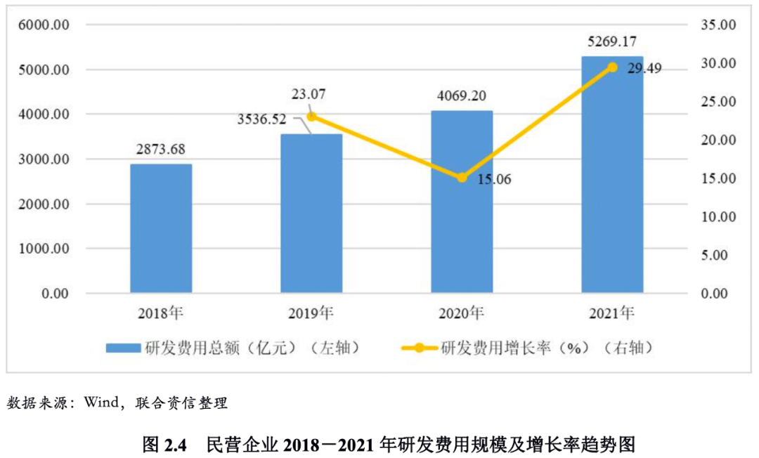 由于盈利能力下降,現(xiàn)金流收緊,民營(yíng)企業(yè)對(duì)未來的預(yù)期趨于謹(jǐn)慎,在長(zhǎng)期資產(chǎn)和研發(fā)方面的投入增速出現(xiàn)較大波動(dòng)。為保證數(shù)據(jù)的可靠性,本報(bào)告采用現(xiàn)金流量表中的“購(gòu)建固定資產(chǎn)、無形資產(chǎn)和其他長(zhǎng)期資產(chǎn)支付的現(xiàn)金”科目作為長(zhǎng)期資產(chǎn)投資的統(tǒng)計(jì)數(shù)據(jù)。2017-2021年間,民營(yíng)企業(yè)的長(zhǎng)期資產(chǎn)投資規(guī)模整體呈增長(zhǎng)趨勢(shì),但增速出現(xiàn)較大波動(dòng),2019年長(zhǎng)期資產(chǎn)投資增長(zhǎng)率僅4.93%,比上年大幅下降31.32個(gè)百分點(diǎn),2020年隨著鼓勵(lì)民企投資政策的出臺(tái),長(zhǎng)期資產(chǎn)投資增速出現(xiàn)反彈,2021年我國(guó)經(jīng)濟(jì)從疫情中顯著復(fù)蘇,帶動(dòng)民企長(zhǎng)期資產(chǎn)投資增速進(jìn)一步走高。由于“研發(fā)費(fèi)用”在利潤(rùn)表中單獨(dú)列示自財(cái)政部發(fā)布《關(guān)于修訂印發(fā)2018年度一般企業(yè)財(cái)務(wù)報(bào)表格式的通知》財(cái)會(huì)〔2018〕15號(hào)后開始,因此對(duì)“研發(fā)費(fèi)用”的統(tǒng)計(jì)期間為2018-2021年,該期間研發(fā)費(fèi)用規(guī)模呈增長(zhǎng)態(tài)勢(shì),但增速也出現(xiàn)波動(dòng),2020年同比增長(zhǎng)率為15.06%,比上年下降8.01個(gè)百分點(diǎn),2021年由于加大研發(fā)費(fèi)用在所得稅中加計(jì)扣除的稅收優(yōu)惠政策推出和經(jīng)濟(jì)的快速?gòu)?fù)蘇,民營(yíng)企業(yè)的研發(fā)費(fèi)用增速出現(xiàn)反彈。由于新冠疫情防控的收緊,國(guó)際局勢(shì)動(dòng)蕩和經(jīng)濟(jì)增速減弱,2022年民營(yíng)企業(yè)的長(zhǎng)期資產(chǎn)投資和研發(fā)投入的增速可能再次走低。
