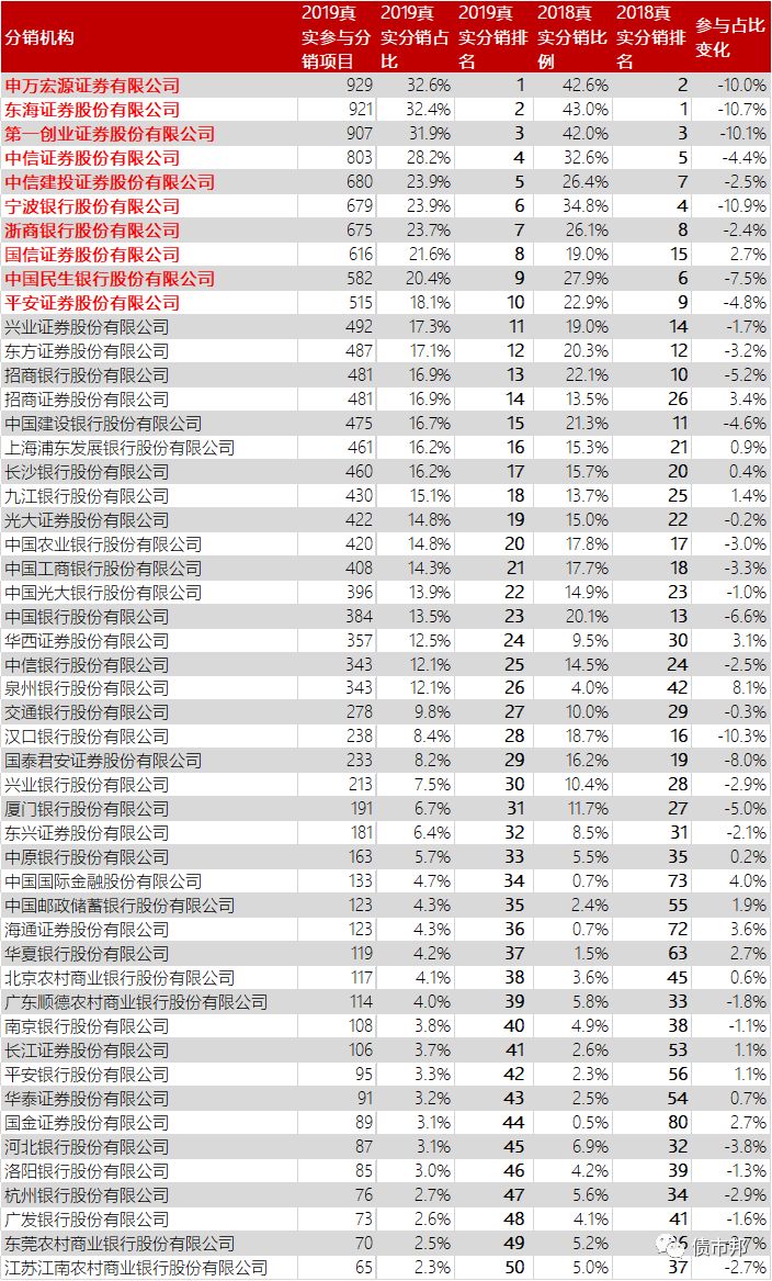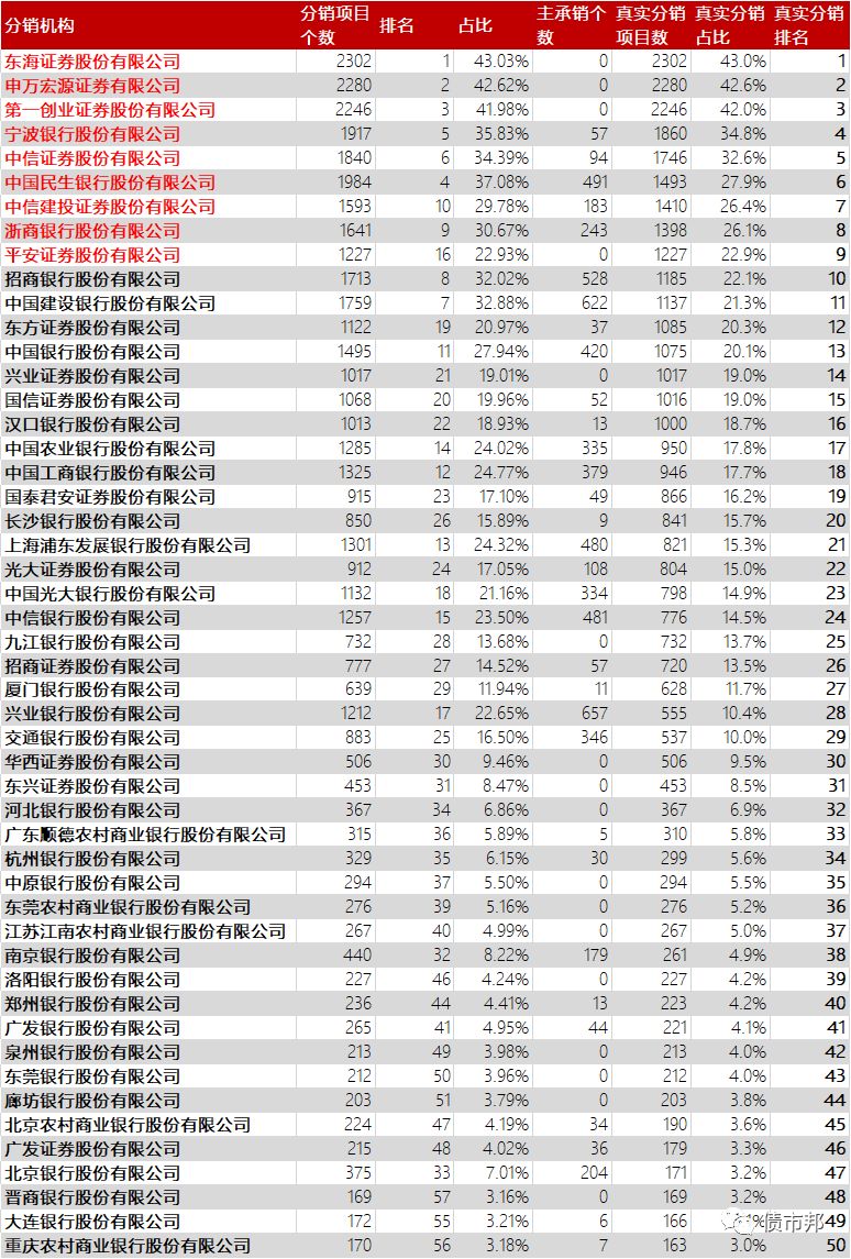 因?yàn)橹鞒袖N商天然就是承銷團(tuán)員,而狹義上的分銷是承銷團(tuán)員參與銷售非所在機(jī)構(gòu)主承的債務(wù)融資工具的行為,為了更好地進(jìn)行對(duì)比,將主承項(xiàng)目剔除后作為真實(shí)分銷項(xiàng)目進(jìn)行排名出來的TOP50,結(jié)果如下所示。