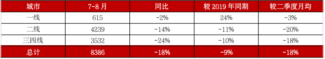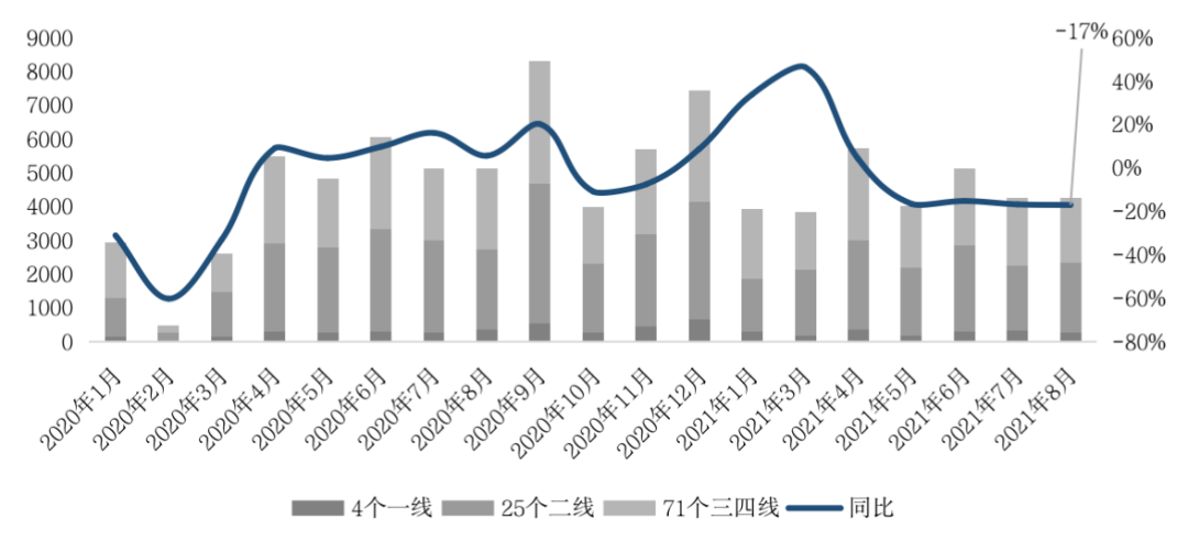 2021年三季度,全國新房成交由二季度“由穩(wěn)轉(zhuǎn)跌”趨勢進一步下行,至8月百城商品住宅成交規(guī)模連續(xù)4個月縮減,單月較2020年和2019年同期降幅擴大至22%和12%,連續(xù)6個月縮減。