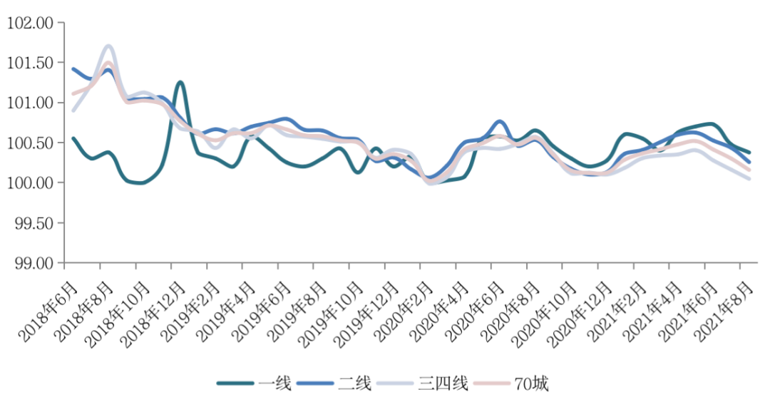圖:2018年6月至2021年8月70個大中城市房價指數(shù)環(huán)比變化