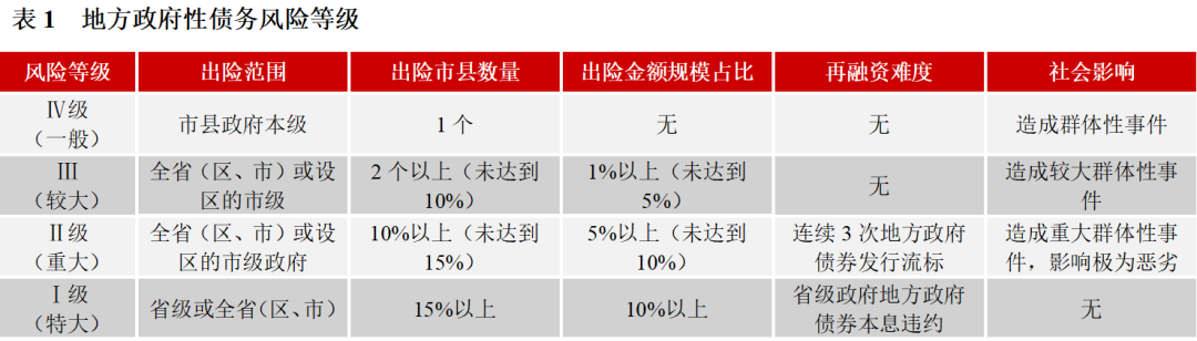 根據(jù)88號文,按照政府性債務(wù)風(fēng)險(xiǎn)事件的性質(zhì)、影響范圍和危害程度等情況,劃分為Ⅰ級(特大)、Ⅱ級(重大)、Ⅲ級(較大)、Ⅳ級(一般)四個(gè)等級,其中,事件性質(zhì)包括本息實(shí)質(zhì)性違約、因兌付政府債務(wù)本息導(dǎo)致無法保障必要的基本民生支出和政府有效運(yùn)轉(zhuǎn)支出、地方政府債券流標(biāo)和地方政府債券實(shí)質(zhì)性違約。本文將具體量化指標(biāo)分為出險(xiǎn)范圍、出險(xiǎn)市縣數(shù)量、出險(xiǎn)金額規(guī)模、再融資難度、社會影響五個(gè)方面來。分級處置機(jī)制是動(dòng)態(tài)的、日常的,當(dāng)政府性債務(wù)風(fēng)險(xiǎn)事件等級隨時(shí)間推移有所上升時(shí),按照升級后的級別處置,同時(shí),分級處置將推動(dòng)政府加強(qiáng)日常流動(dòng)性管理,避免出現(xiàn)因流動(dòng)性管理不善導(dǎo)致政府性債務(wù)違約,觸發(fā)財(cái)政重整條件。