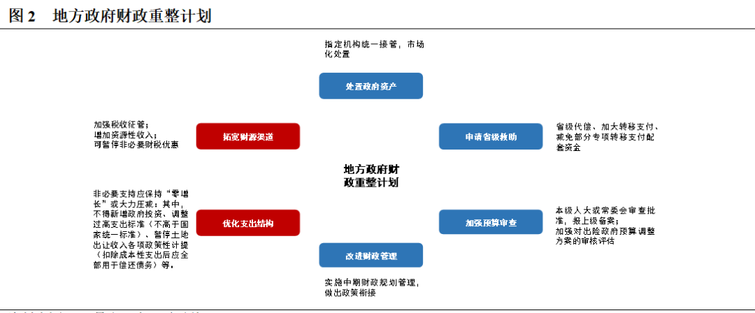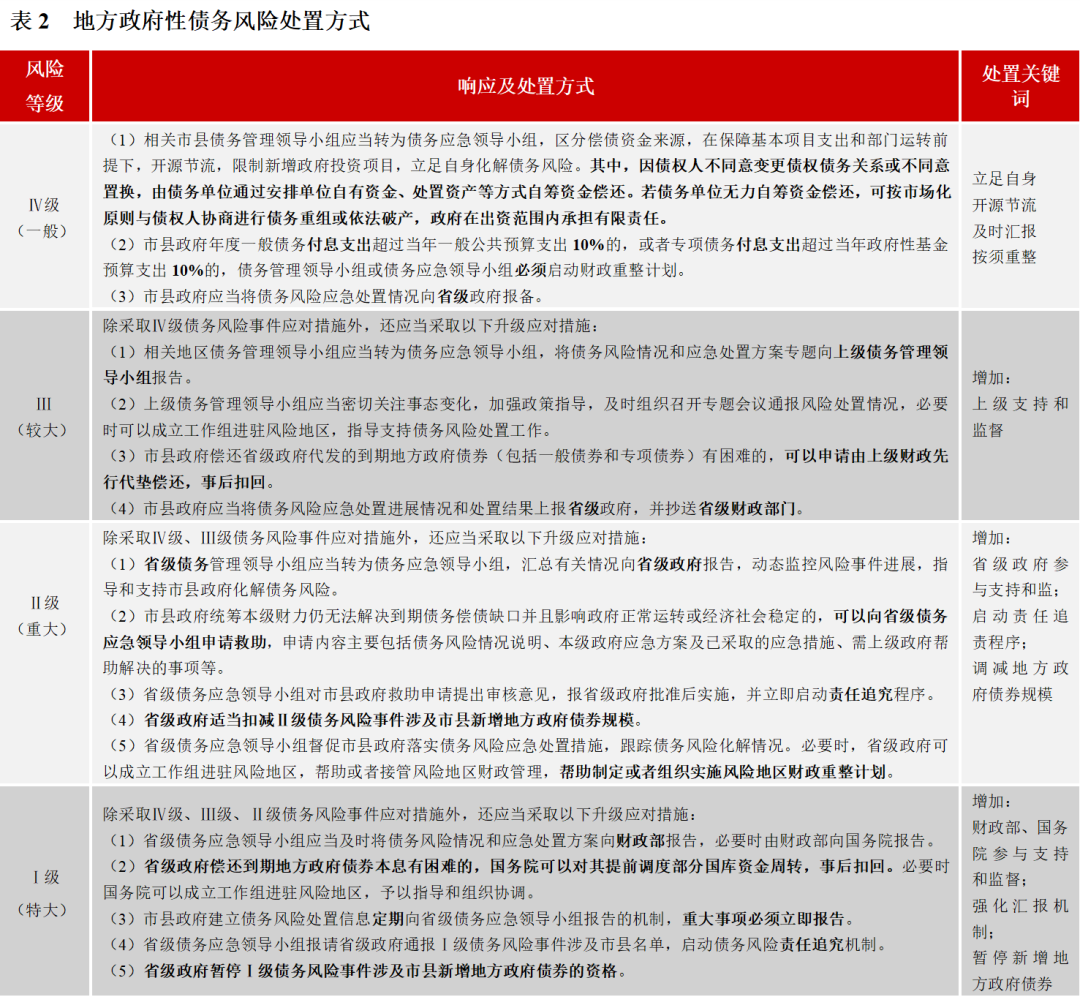 政府性債務(wù)風(fēng)險(xiǎn)處置:(1)分類處置。政府性債務(wù),根據(jù)償還義務(wù)分為地方政府債券、非地方政府債券形式的存量政府債務(wù),以及存量或有債務(wù)、新發(fā)生的違法違規(guī)擔(dān)保債務(wù)等,即顯性債務(wù)和隱性債務(wù)。其中,隱性債務(wù),政府不承擔(dān)償還責(zé)任,僅承擔(dān)民事賠償責(zé)任。(2)分級處置。根據(jù)88號文,按照政府性債務(wù)風(fēng)險(xiǎn)事件的性質(zhì)、影響范圍和危害程度等情況,劃分為Ⅰ級(特大)、Ⅱ級(重大)、Ⅲ級(較大)、Ⅳ級(一般)四個(gè)等級。針對不同等級的風(fēng)險(xiǎn)事件,將采取不同力度的處置措施,隨風(fēng)險(xiǎn)級別的上升,逐級增強(qiáng)管理和救助。(3)財(cái)政重整計(jì)劃。實(shí)施財(cái)政重整計(jì)劃的原因包括地方政府債務(wù)風(fēng)險(xiǎn)無法通過自身解除,或觸發(fā)強(qiáng)制重整條件。相比一般應(yīng)急措施,財(cái)政重整計(jì)劃的處置思路與之一致,但對政府現(xiàn)金流的約束性和支持性更強(qiáng),包括調(diào)整財(cái)政收支、投融資行為的審查、改進(jìn)財(cái)政管理等方面。(4)政策側(cè)重點(diǎn)的轉(zhuǎn)換。隨著三年(2015-2017年)地方政府債券置換期的結(jié)束,非政府債券形式的存量政府債務(wù)基本轉(zhuǎn)換為地方政府債券。2020年來,政策聚焦“化解隱性債務(wù)”,加強(qiáng)地方政府債務(wù)風(fēng)險(xiǎn)管理,其化解核心依然是“償還”為主,償還方式包括地方政府債券置換、自有資金償還,債務(wù)重組等。