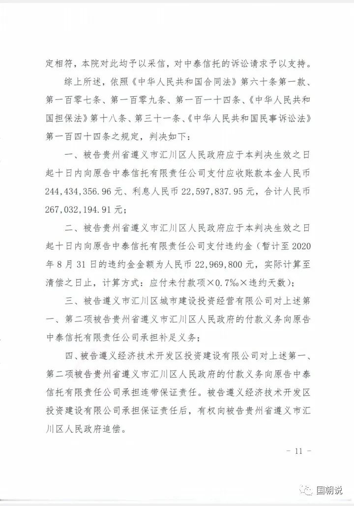 2020年12月30日,上海金融法院公布了一審判決結果,被告貴州省遵義市匯川區(qū)人民政府應于本判決生效之日起十日內向原告中泰信托支付應收賬款本金2.44億元,利息0.23億元,合計2.67億元。