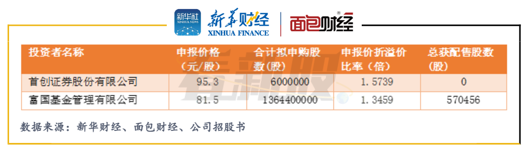 首創證券和富國基金2家投資機構報價大于等于81.5元/股,明顯較高。其中首創證券報出95.3元/股的價格,被直接歸為“無效高價”。高報價雖被剔除,但仍會對最終發行價產生一定影響。