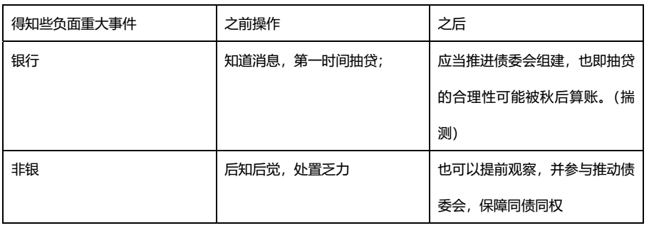 那么如果此后出現較為類似的情況,企業可先下手為強,不至于資金凍結、持續抽貸,則保障正常經營下,對非銀或者其他小債權人,也是一種潛在保護,歷史的教訓也是財富。當然,這個債委會起不到較大作用的點在于,此前銀行抽貸行為視為合法,在既成事實的框架下予以默認,其實效果有限,已經踩踏,企業正常經營難以恢復。