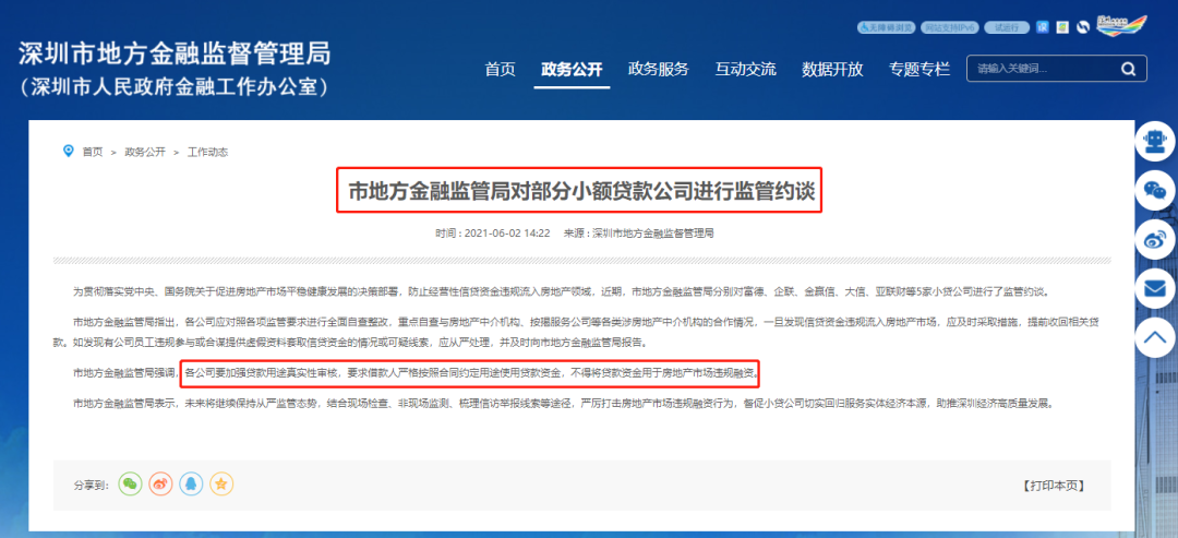 深圳市地方金融監(jiān)管局要求小額貸款公司對(duì)照各項(xiàng)監(jiān)管要求進(jìn)行全面自查整改,重點(diǎn)自查與房地產(chǎn)中介機(jī)構(gòu)、按揭服務(wù)公司等各類涉房地產(chǎn)中介機(jī)構(gòu)的合作情況,一旦發(fā)現(xiàn)信貸資金違規(guī)流入房地產(chǎn)市場,應(yīng)及時(shí)采取措施,提前收回相關(guān)貸款。