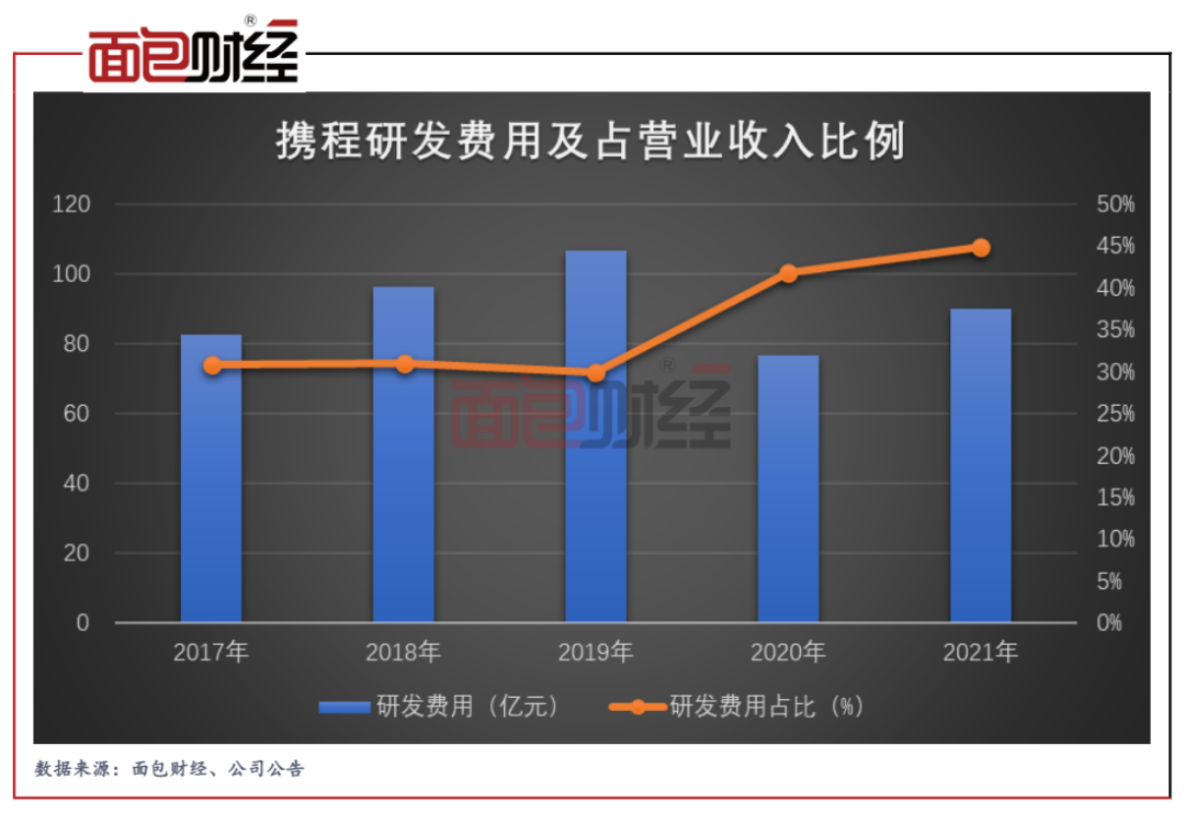 高強(qiáng)度且持續(xù)的研發(fā)費(fèi)用投入,正是攜程持續(xù)投資于未來的重要體現(xiàn)。數(shù)據(jù)顯示,攜程2021年的研發(fā)費(fèi)用達(dá)到90億元,同比增長17%。2021年,公司研發(fā)費(fèi)用占營業(yè)收入的比例更是達(dá)到約45%,相比2020年約42%的高基數(shù)進(jìn)一步上升。
