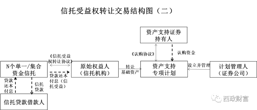 3.信托機構(gòu)與專項資管計劃管理人簽署《信托受益權轉(zhuǎn)讓協(xié)議》,將信托受益權作為基礎資產(chǎn)轉(zhuǎn)讓給專項計劃并設立ABS;