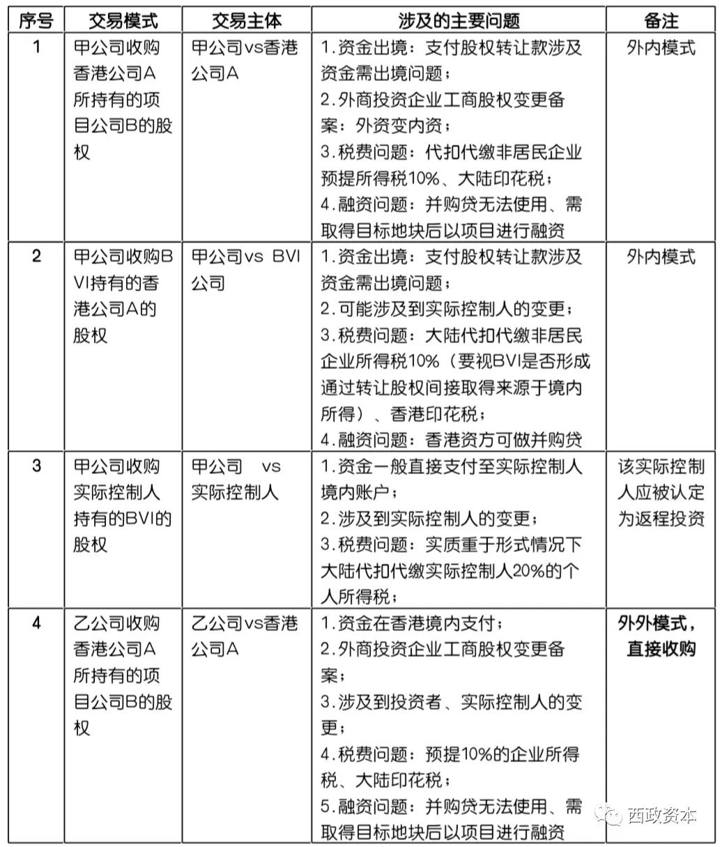 筆者將通過股權轉讓方式收購境內物業的方式歸納為外內模式、外外模式、內外模式以及利用返程投資進行股權收購四種形式。