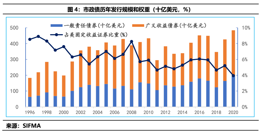 此外,市政債規(guī)模方面,從歷年發(fā)行規(guī)模來看,根據(jù)SIFMA披露的相關(guān)數(shù)據(jù)來看,其規(guī)模維持在5000億美元以下一個較為恒定的區(qū)間,同時從品種結(jié)構(gòu)來看市政債,目前以廣義的項目收益?zhèn)鶠橹鳌?/p>