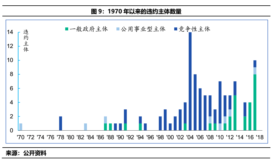 從違約的品種來看,在2010年之前,市政債違約主體以競爭性主體為主,但進入2010年之后,一般政府主體數(shù)量開始激增,競爭性主體數(shù)量開始下滑。