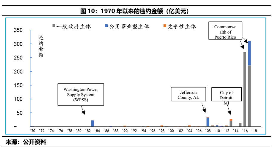 2013年底特律市的破產(chǎn),違約金額高達200億美元;2016-2017年則是美屬波多黎各的債務(wù)違約,涉及金額合計高達400億美元。