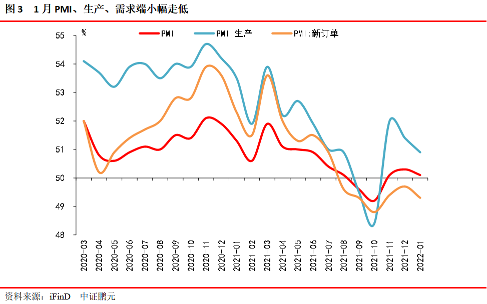 (一)PMI小幅下行,生產(chǎn)和需求有所走低,主要受1月季節(jié)性影響,但穩(wěn)增長(zhǎng)的預(yù)期凸顯