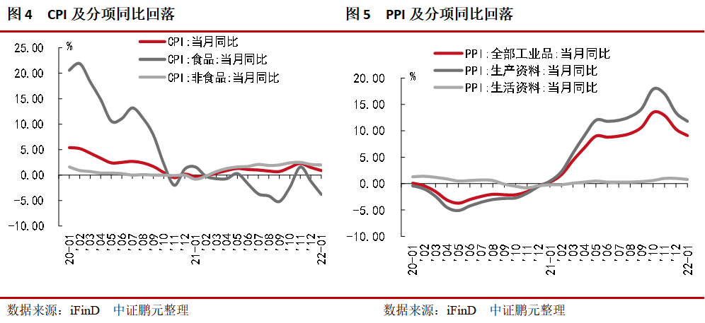 1月PPI同比上漲9.1%,漲幅比上月回落1.2個(gè)百分點(diǎn)。其中,生產(chǎn)資料價(jià)格上漲11.8%,漲幅回落1.6個(gè)百分點(diǎn);生活資料價(jià)格上漲0.8%,漲幅回落1.6個(gè)百分點(diǎn)。從PPI環(huán)比來(lái)看,保供穩(wěn)價(jià)政策有力推進(jìn),煤炭、鋼材價(jià)格繼續(xù)回落,煤炭開(kāi)采和洗選業(yè)價(jià)格下降3.5%,黑色金屬冶煉和壓延加工業(yè)價(jià)格下降1.9%。受?chē)?guó)際原油價(jià)格回升影響,國(guó)內(nèi)石油相關(guān)行業(yè)價(jià)格回暖。石油和天然氣開(kāi)采業(yè)價(jià)格由上月下降6.9%轉(zhuǎn)為上漲2.6%;化學(xué)原料和化學(xué)制品制造業(yè)、化學(xué)纖維制造業(yè)價(jià)格分別下降1.3%和0.1%,降幅比上月分別收窄0.8和3.0個(gè)百分點(diǎn)國(guó)際有色金屬價(jià)格上行,帶動(dòng)國(guó)內(nèi)有色金屬冶煉和壓延加工業(yè)價(jià)格上漲0.8%。