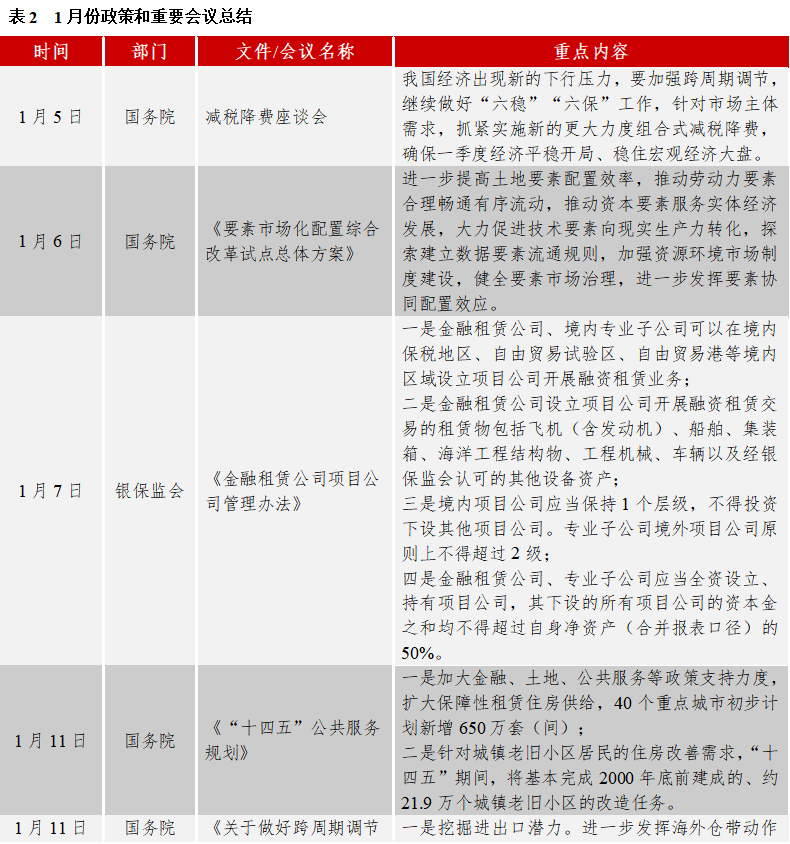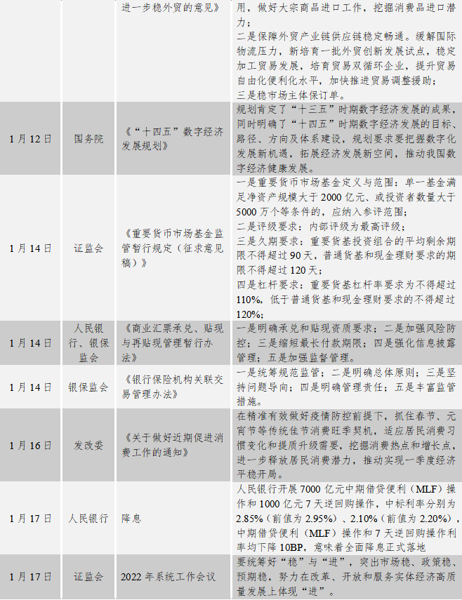 債券市場(chǎng)制度建設(shè)方面:1月7日,銀保監(jiān)會(huì)下發(fā)《金融租賃公司項(xiàng)目公司管理辦法》,對(duì)金融租賃公司、境內(nèi)專業(yè)子公司開(kāi)展融資租賃業(yè)務(wù)進(jìn)行了業(yè)務(wù)、范圍、結(jié)構(gòu)等方面要求和規(guī)范。1月14日,證監(jiān)會(huì)發(fā)布《重要貨幣市場(chǎng)基金監(jiān)管暫行規(guī)定(征求意見(jiàn)稿)》,定義與范圍,杠桿、久期等方面對(duì)重要貨幣基金進(jìn)行了要求。1月14日,人民銀行、銀保監(jiān)會(huì)發(fā)布《商業(yè)匯票承兌、貼現(xiàn)與再貼現(xiàn)管理暫行辦法》,一是明確承兌和貼現(xiàn)資質(zhì)要求;二是加強(qiáng)風(fēng)險(xiǎn)防控;三是縮短最長(zhǎng)付款期限;四是強(qiáng)化信息披露管理;五是加強(qiáng)監(jiān)督管理。1月17日,人民銀行開(kāi)展7000億元中期借貸便利(MLF)操作和1000億元7天逆回購(gòu)操作,操作利率均下降10BP,意味著全面降息正式落地。1月20日,住建部召開(kāi)年度系統(tǒng)工作會(huì)議,要求一是加強(qiáng)房地產(chǎn)市場(chǎng)調(diào)控;二是推進(jìn)住房供給側(cè)結(jié)構(gòu)性改革;三是實(shí)施城市更新行動(dòng);四是實(shí)施鄉(xiāng)村建設(shè)行動(dòng);五是落實(shí)碳達(dá)峰碳中和目標(biāo)任務(wù);六是推動(dòng)建筑業(yè)轉(zhuǎn)型升級(jí)等。1月26日,財(cái)政部發(fā)布《關(guān)于基礎(chǔ)設(shè)施領(lǐng)域不動(dòng)產(chǎn)投資信托基金(REITs)試點(diǎn)稅收政策的公告》,對(duì)我國(guó)基礎(chǔ)設(shè)施REITs試點(diǎn)明確了相應(yīng)部分稅收政策,在資產(chǎn)重組和發(fā)行階段,減免和轉(zhuǎn)讓時(shí)遞延所得稅,這標(biāo)志著中國(guó)REITs稅收制度建設(shè)正式開(kāi)啟,意義重大,公募REITs進(jìn)入快速發(fā)展階段。
