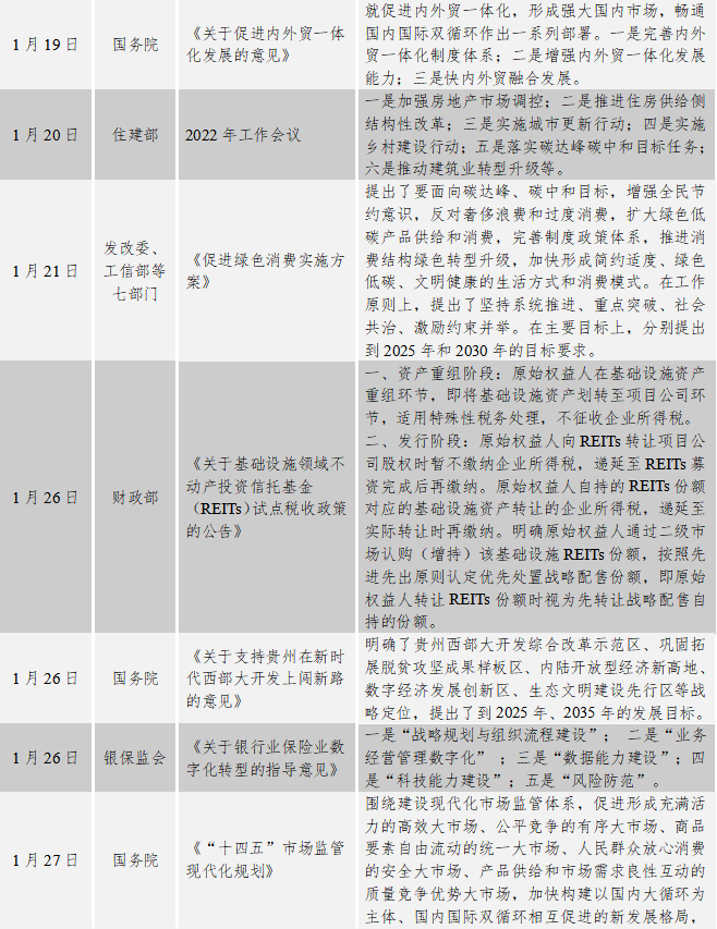 宏觀經(jīng)濟(jì)設(shè)計(jì)方面:1月6日,國(guó)務(wù)院印發(fā)了《要素市場(chǎng)化配置綜合改革試點(diǎn)總體方案》,要求加強(qiáng)資源環(huán)境市場(chǎng)制度建設(shè),健全要素市場(chǎng)治理,進(jìn)一步發(fā)揮要素協(xié)同配置效應(yīng)。本月出臺(tái)了一系列穩(wěn)增長(zhǎng)的政策和措施:國(guó)務(wù)院分別印發(fā)了《關(guān)于做好跨周期調(diào)節(jié)進(jìn)一步穩(wěn)外貿(mào)的意見(jiàn)》、《關(guān)于促進(jìn)內(nèi)外貿(mào)一體化發(fā)展的意見(jiàn)》,對(duì)我國(guó)外貿(mào)進(jìn)一步發(fā)展提出要求;發(fā)改委聯(lián)合相關(guān)部門(mén)分別印發(fā)了《關(guān)于做好近期促進(jìn)消費(fèi)工作的通知》、《促進(jìn)綠色消費(fèi)實(shí)施方案》,對(duì)促進(jìn)消費(fèi)和綠色消費(fèi)的措施進(jìn)行了明確。1月,國(guó)務(wù)院分別印發(fā)了多份“十四五”發(fā)展規(guī)劃:《“十四五”數(shù)字經(jīng)濟(jì)發(fā)展規(guī)劃》、《“十四五”公共服務(wù)規(guī)劃》、《“十四五”市場(chǎng)監(jiān)管現(xiàn)代化規(guī)劃》、《關(guān)于支持貴州在新時(shí)代西部大開(kāi)發(fā)上闖新路的意見(jiàn)》。
