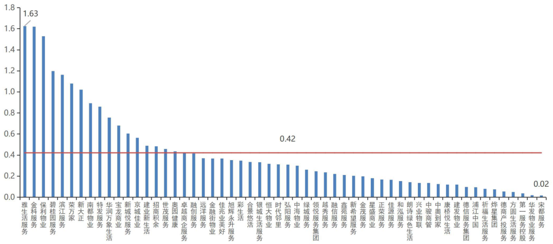 從每股收益上看, 56家上市物企每股收益均值為0.42元,雅生活服務每股收益最高為1.63元,其次是金科服務和保利物業,分別為1.62元和1.53元。這三家每股收益明顯高于其他上市物企。