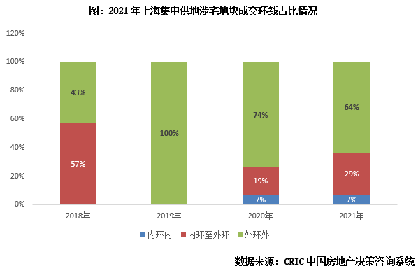 從2021年整體涉宅用地成交環(huán)線分布來(lái)推斷2022年新增供應(yīng)區(qū)域結(jié)構(gòu),可以看出,涉宅用地外環(huán)以內(nèi)成交占比已攀升至36%;其中內(nèi)環(huán)至外環(huán)的占比由2020年的19%上升了10個(gè)百分點(diǎn)至2021年的29%,市中心內(nèi)環(huán)內(nèi)涉宅用地保持稀缺,2021年占比僅為7%,而外郊環(huán)、郊環(huán)外為主供場(chǎng),成交活躍板塊多為五大新城、大虹橋區(qū)域。