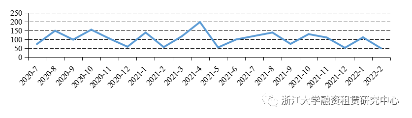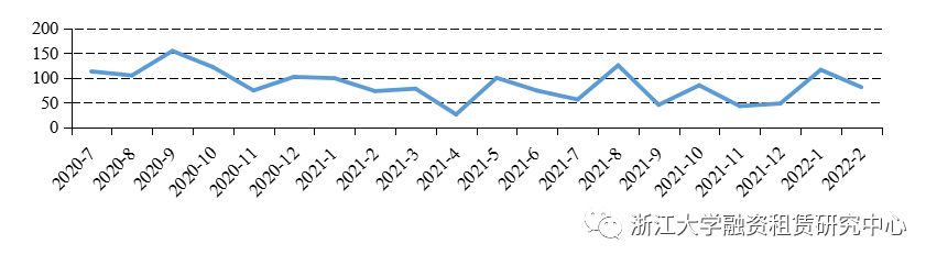 圖2融資租賃公司各月資產(chǎn)支持證券發(fā)行金額統(tǒng)計(jì)(億元)