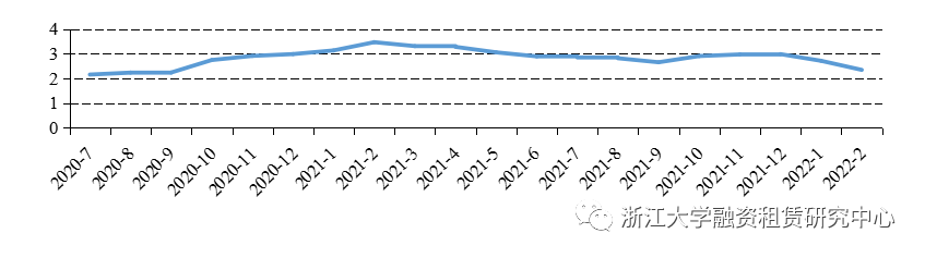 在發(fā)行利率方面,2022年2月融資租賃公司短融/超短融平均發(fā)行利率為2.34%,環(huán)比下降37個(gè)BP,同比下降113個(gè)BP。大唐融資租賃有限公司2022年度第一期超短期融資券票面利率最低,為2.21%;遠(yuǎn)東國際融資租賃有限公司2022年度第一期超短期融資券票面利率最高,為2.50%。