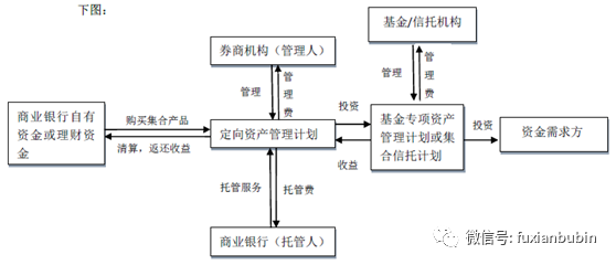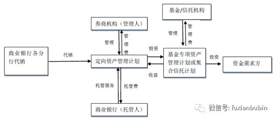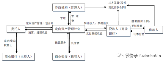 商業(yè)銀行理財資金或自有資金委托券商機構(gòu)成立定向資產(chǎn)管理計劃,投資于存量信貸資產(chǎn)。業(yè)務(wù)原先主要是用于表內(nèi)轉(zhuǎn)表外或調(diào)整信貸規(guī)模,業(yè)務(wù)流程如下圖: