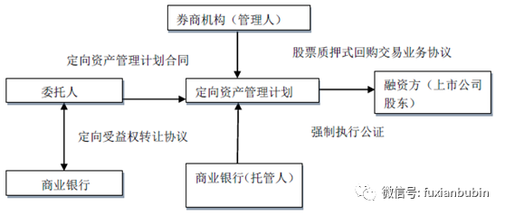 商業(yè)銀行理財資金或自有資金委托券商機構(gòu)成立定向資產(chǎn)管理計劃,由券商機構(gòu)進行交易所場內(nèi)股票質(zhì)押回購融資;股票質(zhì)押回購融資亦可設(shè)計成集合資產(chǎn)管理計劃,由商業(yè)銀行出資投資或由商業(yè)銀行各分行代銷。項目可由商業(yè)銀行各分行及券商機構(gòu)推薦。業(yè)務(wù)流程如下圖: