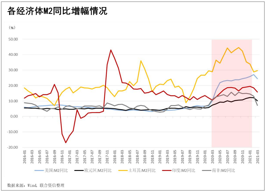 1.為了減輕新冠疫情的影響、刺激經濟增長,全球大部分經濟體在疫情期間都采用了寬松的貨幣政策,因此各國貨幣供應量M2自2020年以來顯著上揚。