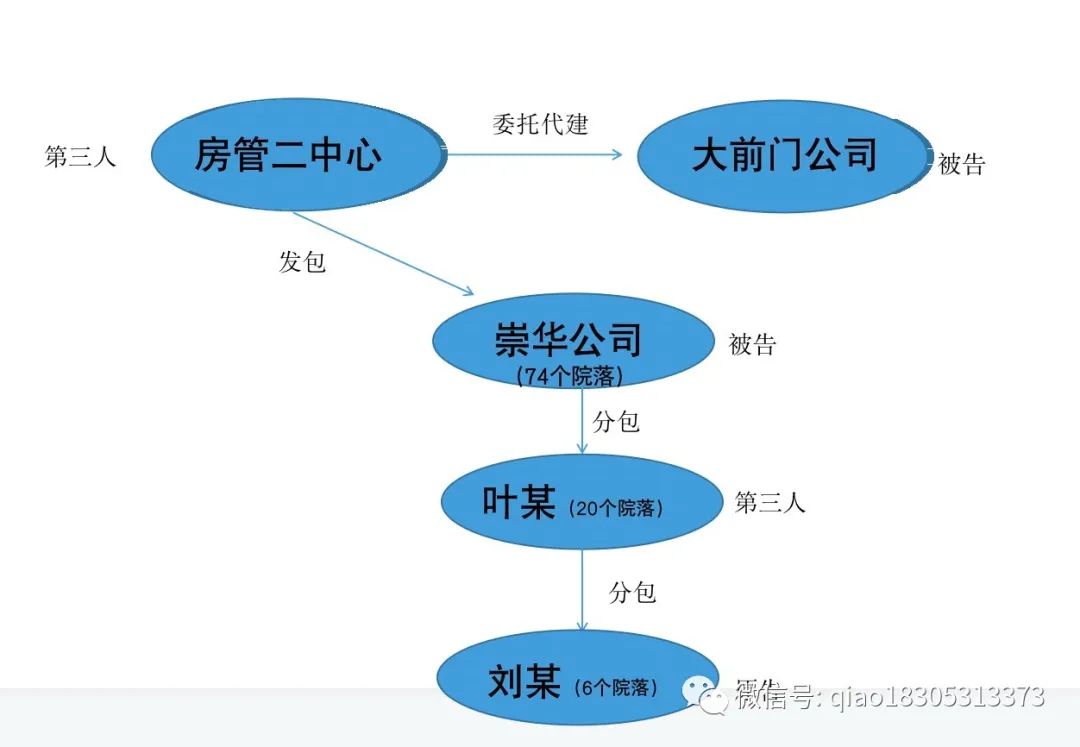 根據(jù)查明事實(shí),發(fā)包人為房管二中心,大前門公司為代建單位,承包人為崇華公司,崇華公司將部分工程分包給了葉某,劉某與崇華公司、大前門公司均未簽訂施工合同,也未提供證據(jù)證明存在事實(shí)施工合同關(guān)系,故劉某與二被告不存在施工合同關(guān)系。