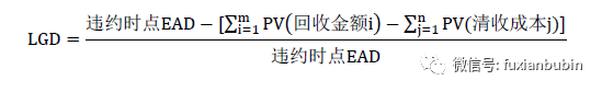 公式中,清收成本現值則是違約債項清收所發生的直接和間接成本的現值總和。而債項回收現值的計算,是債項自違約時點起所有屬于該債項的實際回收現金流在違約時點的現值總和。計算公式為:
