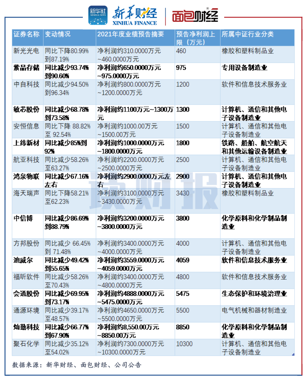 經統計,17家科創板公司預計凈利潤為正但同比下滑,其中中自科技和紫晶存儲預計歸母凈利潤的同比降幅均超過九成。此外,方邦股份已于2022年2月17日發布2021年年報,公司實際錄得歸母凈利潤3783.31萬元,同比減少68.27%,處于業績預告的范圍內。