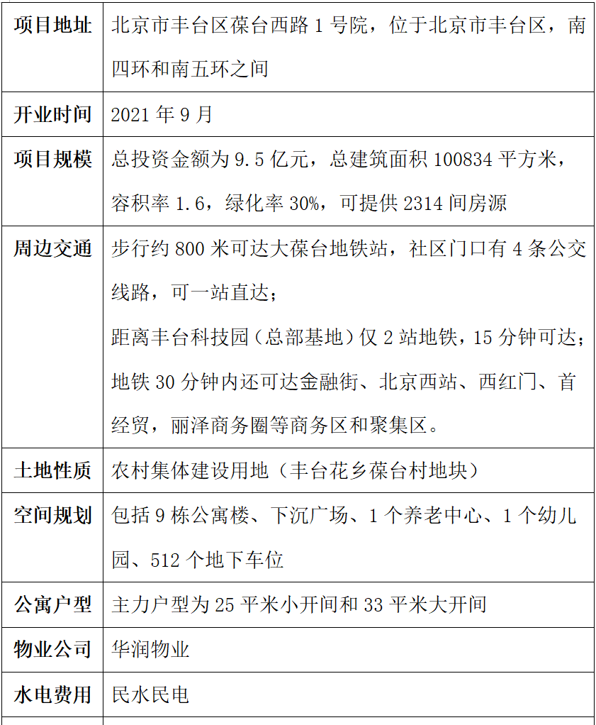華潤有巢國際公寓社區總部基地店的項目土地,由豐臺區花鄉地區葆臺村提供,在2018年取得《北京市規劃和國土資源管理委員會鄉村建設規劃條件》和用地審批后,由華潤置地聯合平安不動產共同開發,并由華潤置地旗下長租公寓品牌有巢運營。