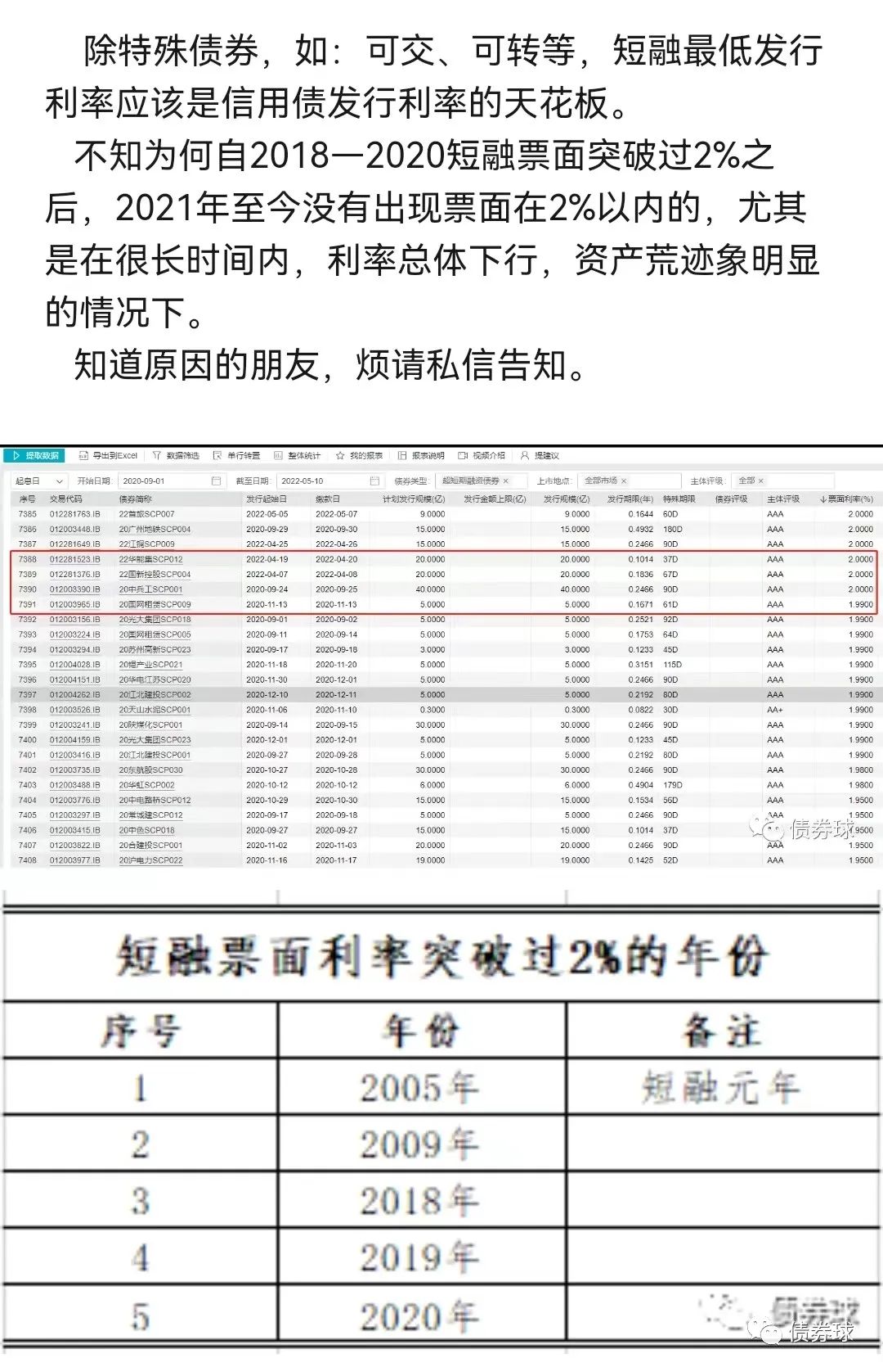 而在此之前,2018-2020連續3年出現突破2%的情況,其中2020年突破2%的案例特別多,就短融來說,突破2%的有1339只,最低的票面只有0.95%,20招商局SCP001。