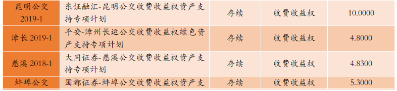 公交收費收益權是收費路橋收益權其中一種,除此之外還有汽車客運收費收益權、地鐵票款收費收益權、鐵路客運收費收益權、停車費收費收益權、高速車輛通行費收益權、港口服務費收益權等。收費路橋收益權發行概況如下圖所示: