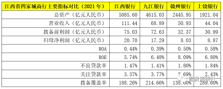 截至2021年底,九江銀行總資產為4615億元、贛州銀行為2446億元、上饒銀行為1921億元。從指標對比上看,江西銀行在江西省四大城商行中,雖不是最好的,但也絕不是最差的。