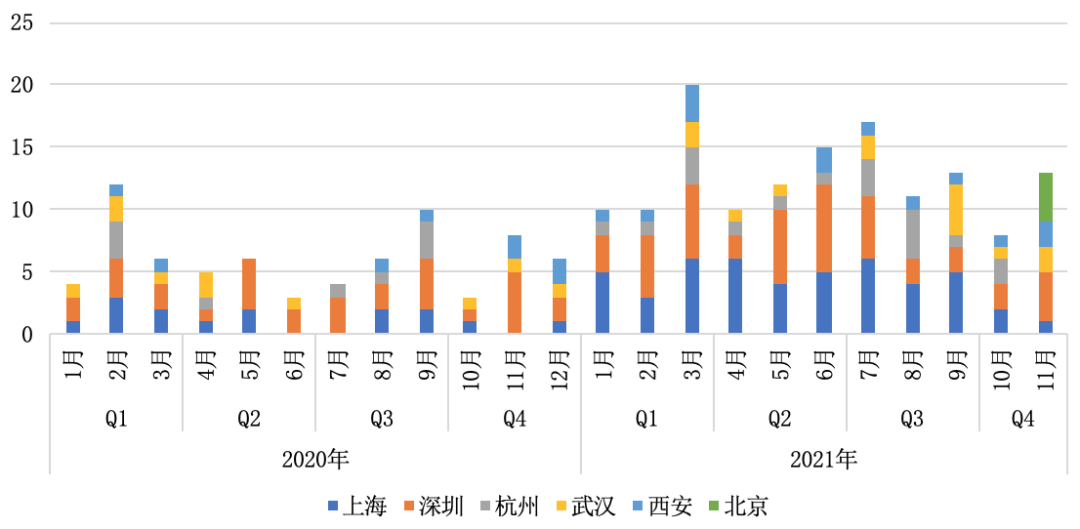 圖:2020年-2021年11月部分核心城市政策規劃出臺數量(單位:條)