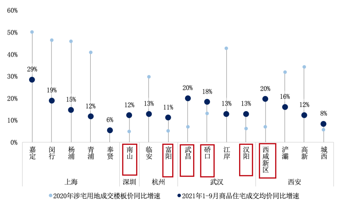 部分區域土地供應受限導致稀缺宅地價格走高,區域地價高漲帶動新房高熱。上海最為顯著,嘉定、閔行、楊浦和青浦四區地價同比漲幅超40%,房價同比漲幅則均超10%,其中嘉定房價同比增29%,即使有集中供應對區域均價的攤薄也收效不佳。諸如此類地,杭州臨安區、武漢江岸區、西安高新區地價同比增速均超30%。從市場表現來看,上述幾區軍事樓市熱度最高的區域,出現了“萬人搖”等一房難求現象。
