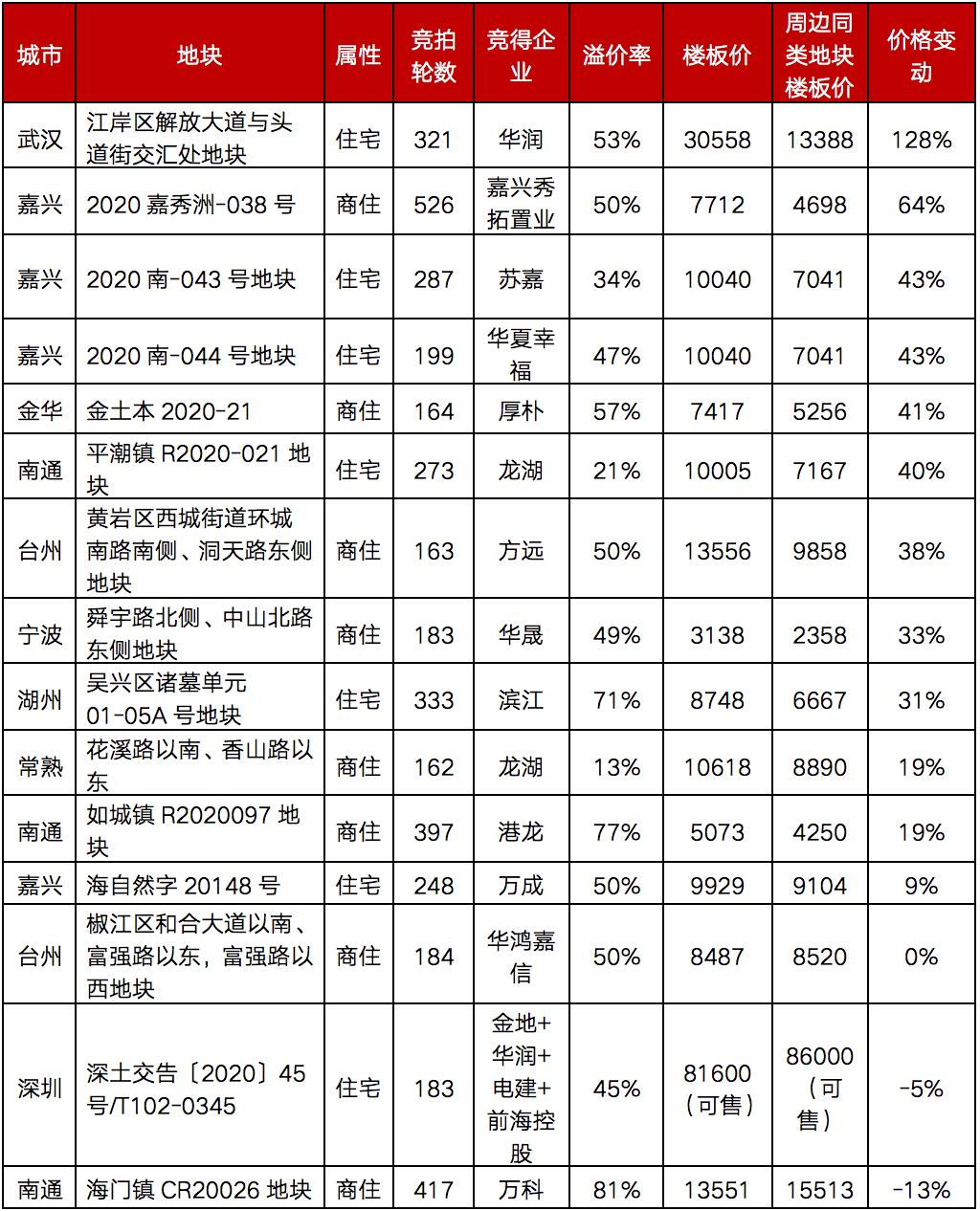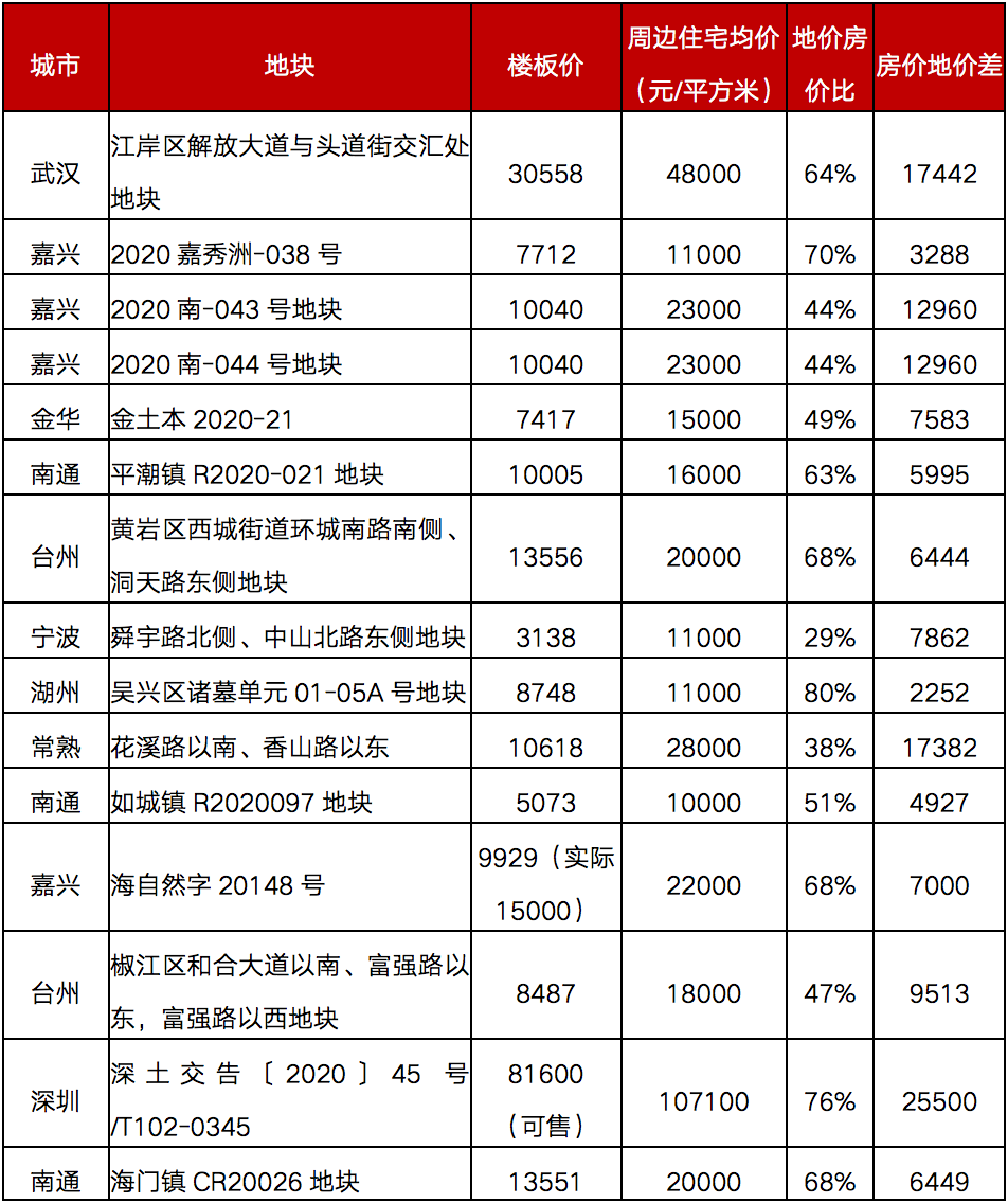 其中漲幅最大的地塊位于武漢,11月13日,武告字(2020年)19號江岸區二七濱江板塊純宅地出讓,地塊起始價43億元,起始樓面價20000元/平方米,土地資源極其稀缺,參與該地塊競爭的企業包括萬科、電建、華潤、平安、中海、大華、華發等,經過321輪競價,最終由華潤以總成交價65.7億斬獲,成交樓面價30558元/平方米,溢價率52.79%,成為武漢市單價地王,相較周邊同類型地塊樓板價增加128%;尤其值得注意的是,武漢之前的單價地王——碧桂園漢陽濱江P(2016)064號地塊的樓面價僅20017元/平方米,相比之下,地王樓板價漲幅高達52.66%。