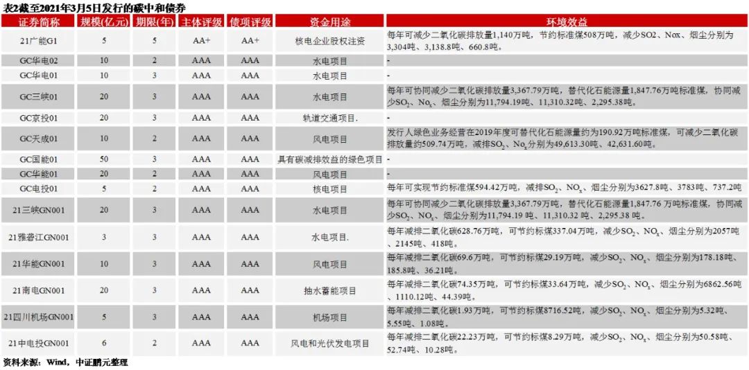 此外,綜合來看,目前碳中和公司債券、碳中和債務融資工具發(fā)行主體信用資質(zhì)為AA+、AAA級等高級別,屬于央企、地方國企;碳中和債券均是公開發(fā)行;債券期限方面,以2年期、3年期短期限品種為主;募投項目以水電、風電、光伏發(fā)電、核電、抽水蓄能項目等清潔能源為主,也有軌道交通、低碳綠色建筑項目。從募投項目的環(huán)境效益來看,雖然均有碳減排環(huán)境效益,但是各項目減排的碳量有顯著差異,以募投項目每年減排的二氧化碳量來看,分布在1.93萬噸~3,367.79萬噸。