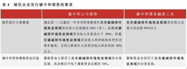 在我們此前的報告《綠色債券的2020,綠色企業(yè)主體如何認證?》中介紹了綠色產(chǎn)業(yè)領域企業(yè)發(fā)行綠色債券的情況。已發(fā)行的碳中和公司債中,華能天成融資租賃有限公司發(fā)行的“GC天成01”就是經(jīng)認證為綠色企業(yè)的主體發(fā)行的。結(jié)合綠色企業(yè)主體的認定標準,我們認為,綠色企業(yè)主體如果要發(fā)行碳中和債券,需要滿足的要求見下表。