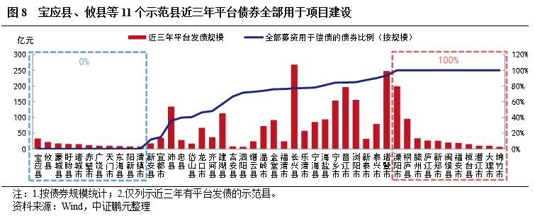寶應縣、攸縣等11個示范縣近三年平臺債券全部有項目建設用途,推測其地區債務率偏低,可挖掘這11個地區的發債空間。由于自2019年起實施的紅橙黃綠四檔債務率管理制度,債務率偏高的地區發債只能用于借新還舊,不允許新增發債,因而對于近三年仍能新發債券用于項目建設的地區而言,一方面說明其平臺資質相對尚可,另一方面可以合理推測該地區所處縣或上級地級市(注:政策初期是看縣一級的債務率,2021年末起看所處地級市的債務率)的債務率相對偏低,對于一級承攬承做機構來說,或可挖掘這些地區的業務空間。同時,也有11個示范縣近三年的平臺債券全部用于償債,為溧陽市、桐廬縣等地區。