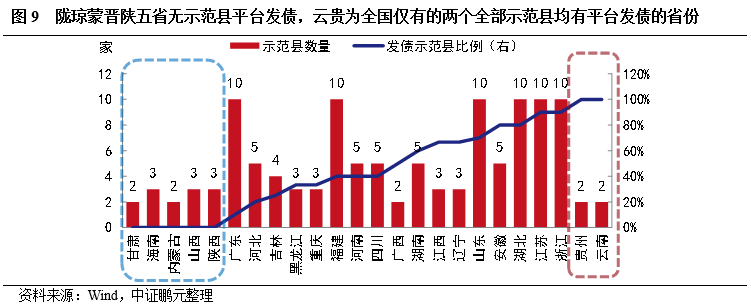 1.甘肅、海南、內蒙古、山西、陜西五省,歷史上從未有示范縣平臺發過債的,或與縣級經濟較弱、平臺資質較差、金融資源偏少等相關。