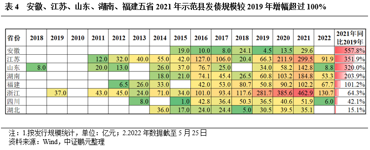 盡管《指引》審核的是項目,而非發債企業,但對縣及縣級市、特別是示范縣城投平臺發債的提振作用是不言而喻的。根據統計數據,2021年示范縣發債平臺數量和融資規模較2019年分別增長42%和118%。2022年5月,國務院發文,繼續加大縣城城鎮化建設的政策支持力度,并將政策提升至國家層面。可以預見,在未來縣一級特別是示范縣發債將會有更大突破。