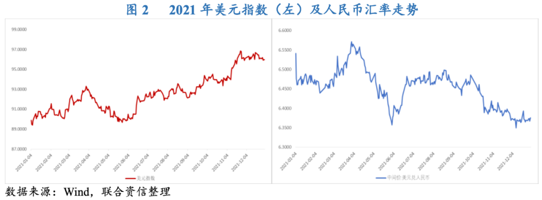 得益于疫情控制得當、宏觀經濟運行良好以及其他主要經濟體在進入經濟復蘇階段后對外貿易需求大幅釋放、并有力提振了中國出口貿易,人民幣在2021年仍處于動態升值區間。盡管中國央行在二季度末試圖通過上調存款準備金率以減輕人民幣過快升值帶來的影響,但美元兌人民幣匯率僅在三季度保持了一段時間的窄幅雙向浮動后便繼續下跌。