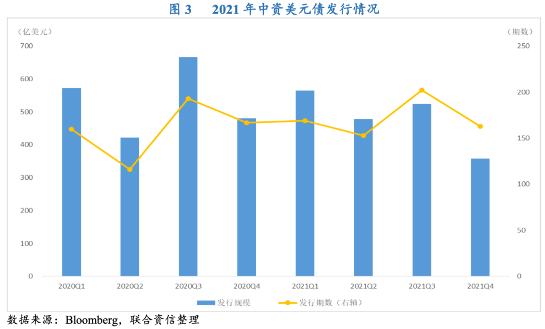 2021年,中資美元債一級市場共發行687期,同比增長8.0%;發行總額較2020年下降10.0%至1,923.2億美元。