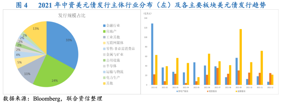 從發行主體行業分布[2]看,2021年金融板塊、房地產板塊和城投板塊仍是中資美元債市場發行主力,發行規模合計占發行總額比重較2020年進一步上漲至71.5%。