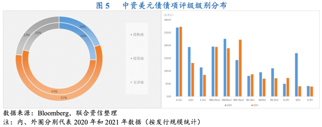 2021年共有357期中資美元債選擇無評級[3]發行,占全部發行期數的比重同比上漲6.4個百分點至52.0%;發行規模451.0億美元,占發行總額的比重同比上漲2.3個百分點至23.4%。