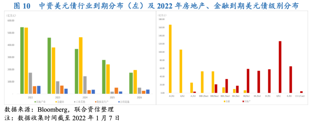 2022年,中資美元債市場共有逾1,600億美元債務到期,是近5年債務到期規模最高峰。從行業分布來看,2022年到期債務主要來自房地產業、金融業、工業其他、勘探及生產和公用設施,其中房地產板塊到期美元債162只,合計金額564.78億美元,占全年到期總額的33.57%;金融板塊到期美元債213只,合計金額562.19億美元,占全年到期總額的33.41%,是2022年償付規模最大的兩個板塊。由于房地產到期美元債主要集中在投機級、且行業回款特性和監管限債要求導致民營企業普遍面臨資金鏈壓力偏高的局面,而金融到期美元債評級以A檔級別居多,預計2022年房地產板塊仍將是信用風險暴露的主要陣地。